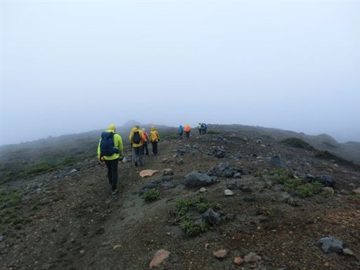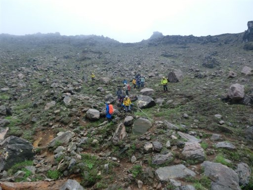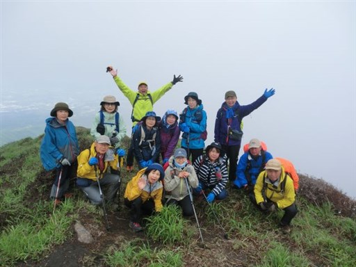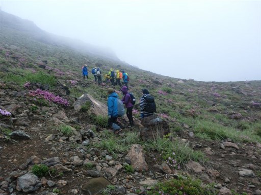 当日は、みちのりトラベル東北が主催する「お山の学校」一行を中岳・高岳に案内する予定でしたが、 尾根付近は強風のため中岳まで登り、高岳は残念ながら安全を考慮し断念しました。 その代わりに、砂千里から皿山に迂回して登りました。ミヤマキリシマは、まだピンクの花で 山々を染めていました。下山途中からは、霧が晴れて砂千里一帯が見えたことで、 感動の声が上がっていました。 お疲れさまでした 戻る