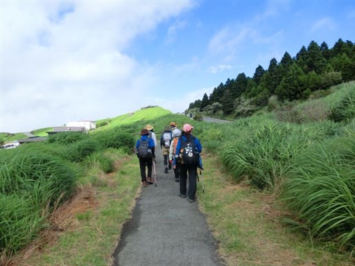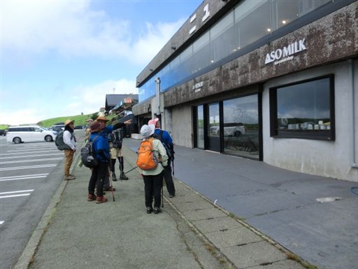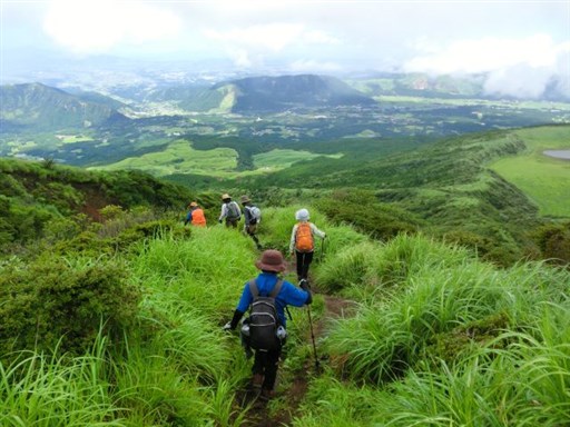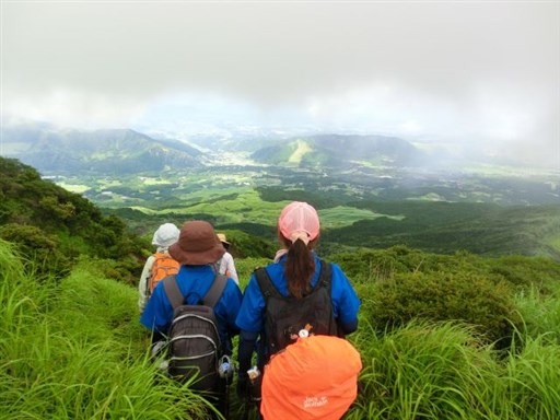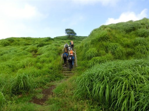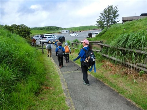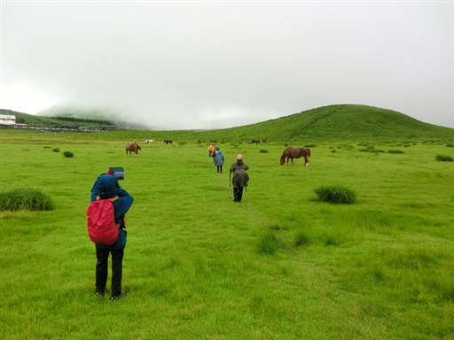 当日は高岳・中岳登山の予定でしたが、台風の影響で風が強いので、烏帽子岳に変更しました。 時々雨がパラツクため、合羽を着たり脱いだりしながらの登山でした。 遊覧のヘリコプターや草千里の乗馬も風や雨のため、中止されていました。 草千里の馬は、仕事がないことからゆったりと草を食べていました。
